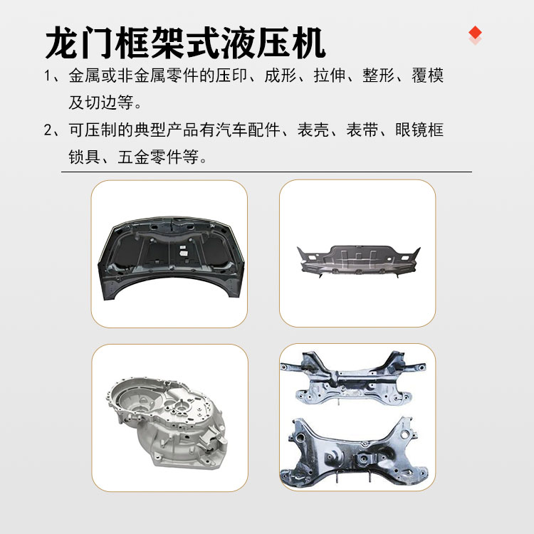 【產(chǎn)品描述】:30噸龍門框架式液壓機是一種高效、精準的壓力成型設(shè)備,廣泛應(yīng)用于各種金屬、非金屬材料的壓制、成型和校正工藝中。其獨特的龍門框架設(shè)計和強大的液壓驅(qū)動系統(tǒng),使其具有出色的穩(wěn)定性和工作效率,成為現(xiàn)代工業(yè)生產(chǎn)中不可或缺的重要設(shè)備。 30噸龍門框架式液壓機采用高強度鋼材構(gòu)建龍門式框架,保證了設(shè)備的穩(wěn)固性和剛性。機身采用優(yōu)質(zhì)鋼板焊接而成,經(jīng)過精細的熱處